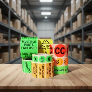 Stickers op rol voor verzendprocessen ("Multiple Parts Enclosed", "Heavy Load", "Customs"), maximum gewicht stickers voor stellingen (standaardgewichten 125-3200 kg), QC-stickers voor kwaliteitscontrole. Fluorescerende kleuren voor snelle visuele herkenning. Compatibel met automatische etiketteersystemen en handmatige verwerking. Leverbaar per 500 of 1000 stuks voor efficiënte voorraadplanning.
